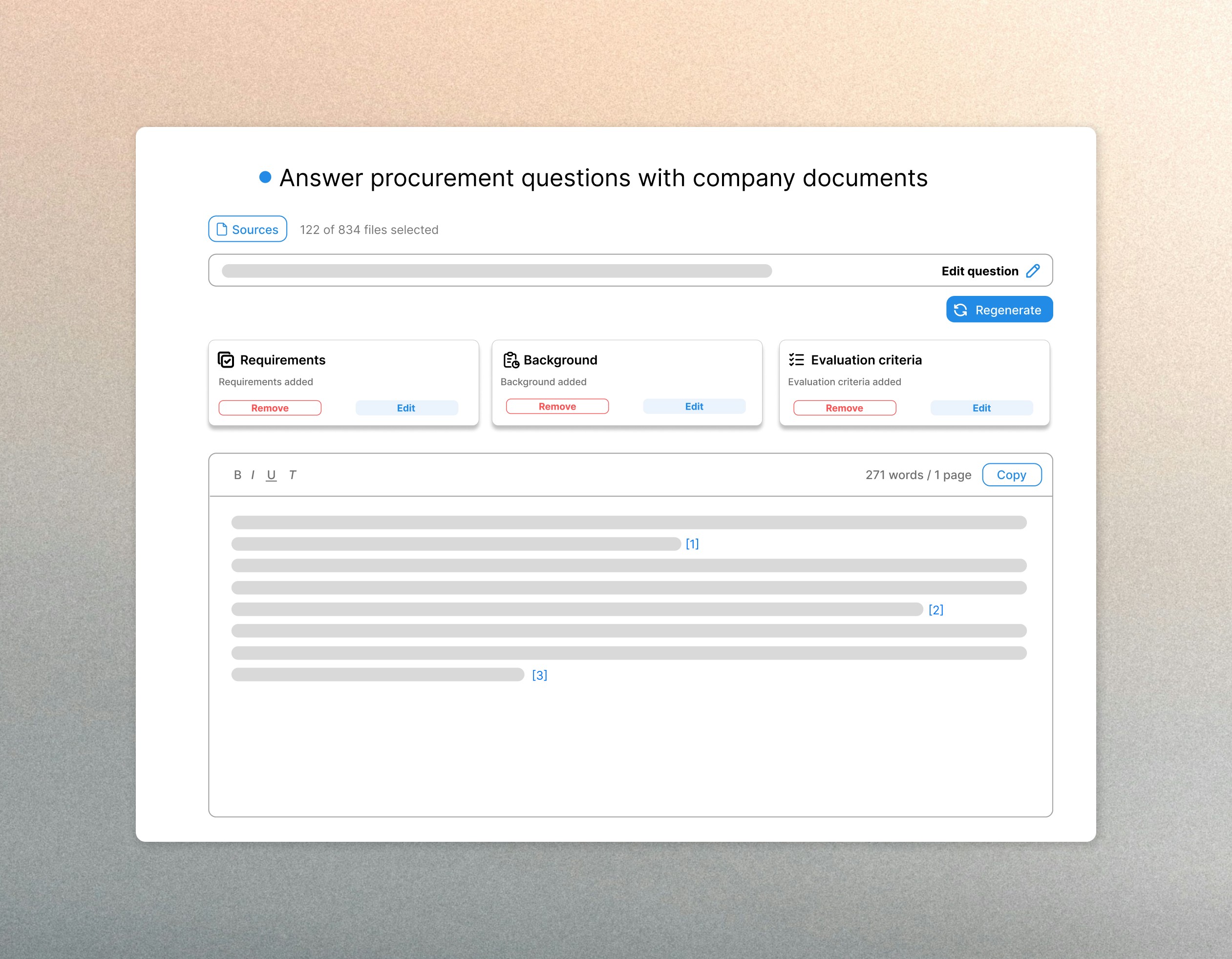 Use your existing company data and previous bids to automatically generate responses in just a few seconds.